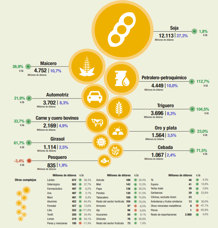 Si se evalúan únicamente los complejos exportadores, los que representan un mayor porcentaje en la exportación argentina son el complejo sojero (27,3%) , el maicero (10,7%), el petrolero-petroquímico (10%), el automotriz (8,3%) y el triguero (8,3%). Luego continúan en menor proporción, el complejo carne y cueros bovinos, oro y plata, girasol, cebada y pesquero, entre otros.