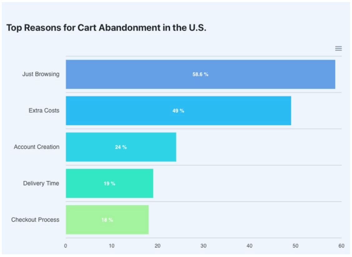 Si bien las estadísticas son diversas y existen numerosos reportes al respecto, el Instituto de Baymard1 concluyó que aproximadamente el 70% de los carritos de compra online se abandonan. ¿A qué se debe esto? Los datos muestran que alrededor del 60% de los encuestados no tenía intenciones de compra durante la navegación. Sin considerar a estos encuestados, se encuentra que aproximadamente el 40% abandona sus carteras por costos extras, tales como envío, impuestos y otros adicionales.